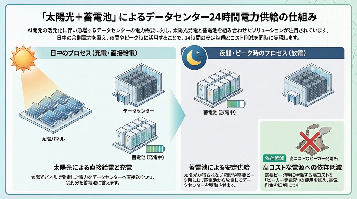 日中に太陽光で発電した電力を蓄電池に貯蔵し、需要が高まる夕方から夜間にかけて放電することで、ガス火力に頼らずともDCが必要とする安定的な電力を確保する動きが加速しています。